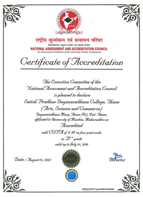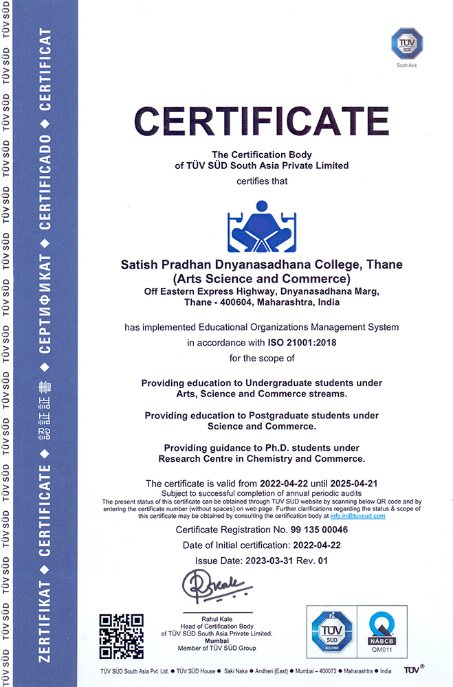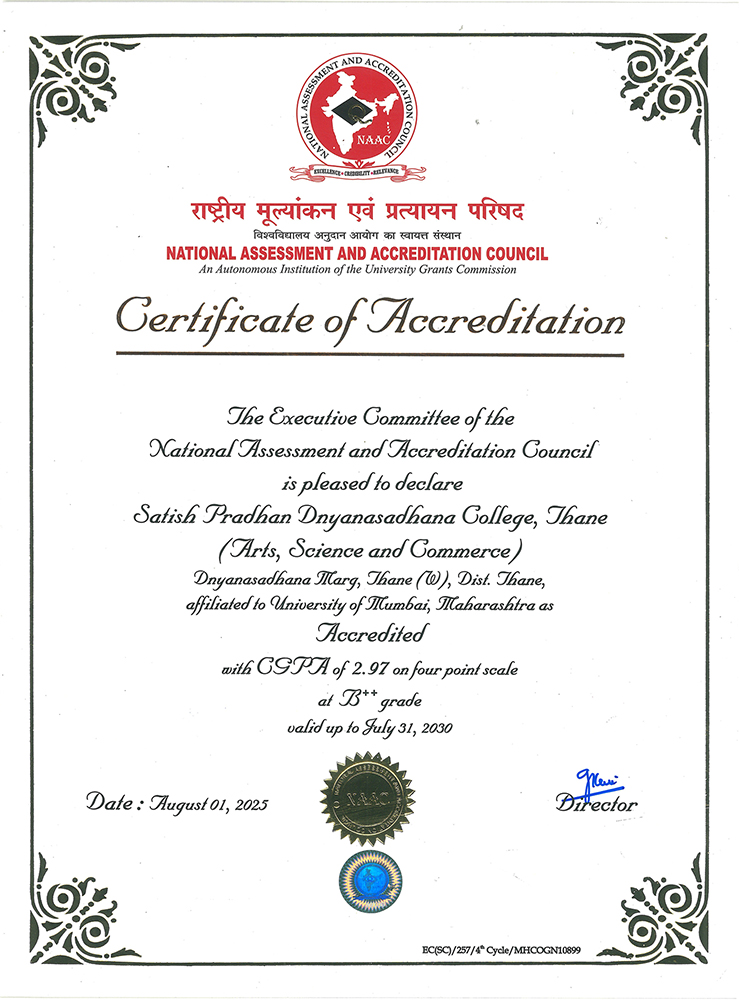 Dnyanasadhana, Thane Society's Satish Pradhan Dnyanasadhana College, Thane (Arts, Science and Commerce) Re-Accredited by NAAC "B++" (CGPA 2.97), 4th Cycle, ISO 21001:2018 (Certified) Affiliated To University of Mumbai